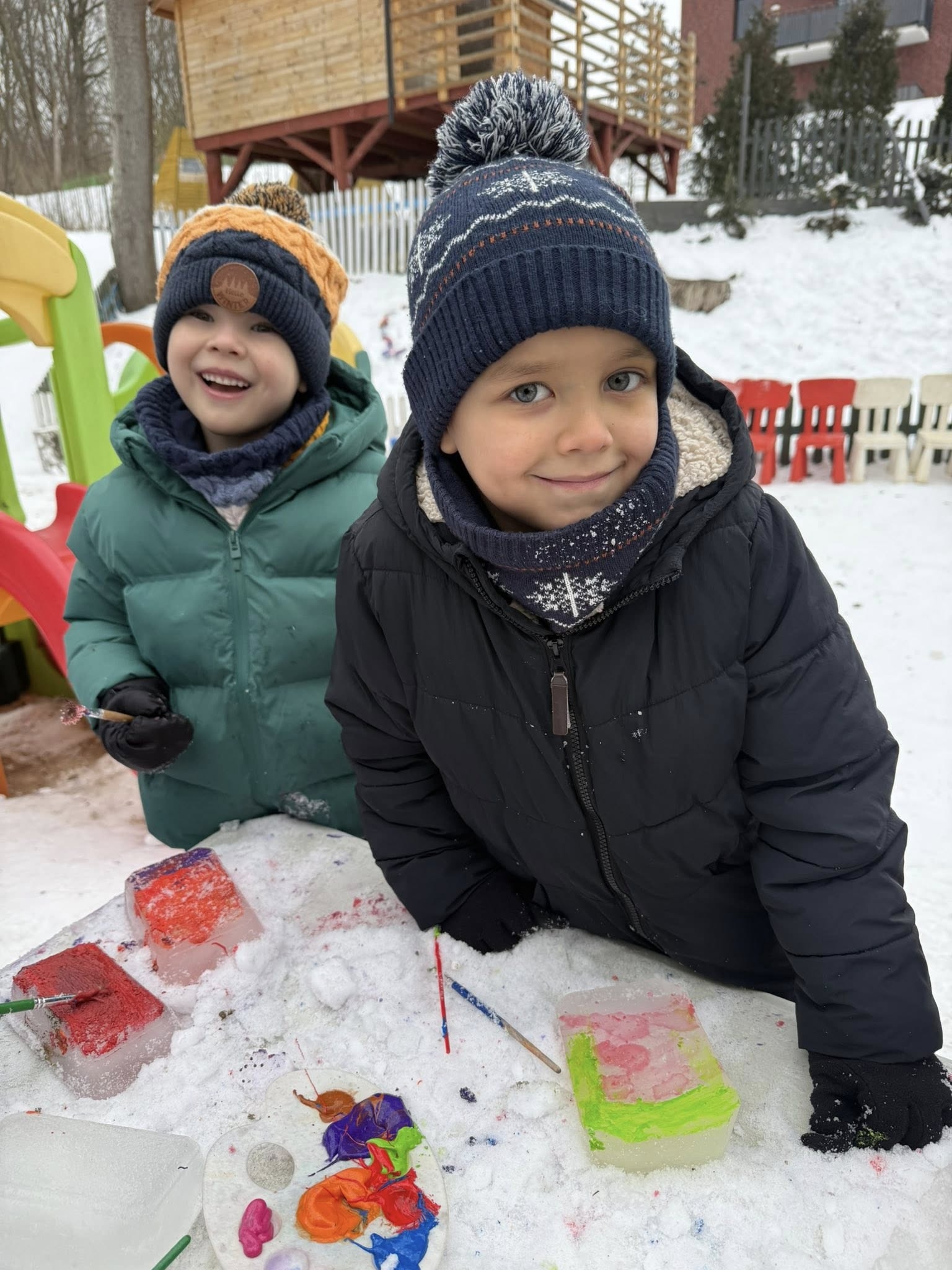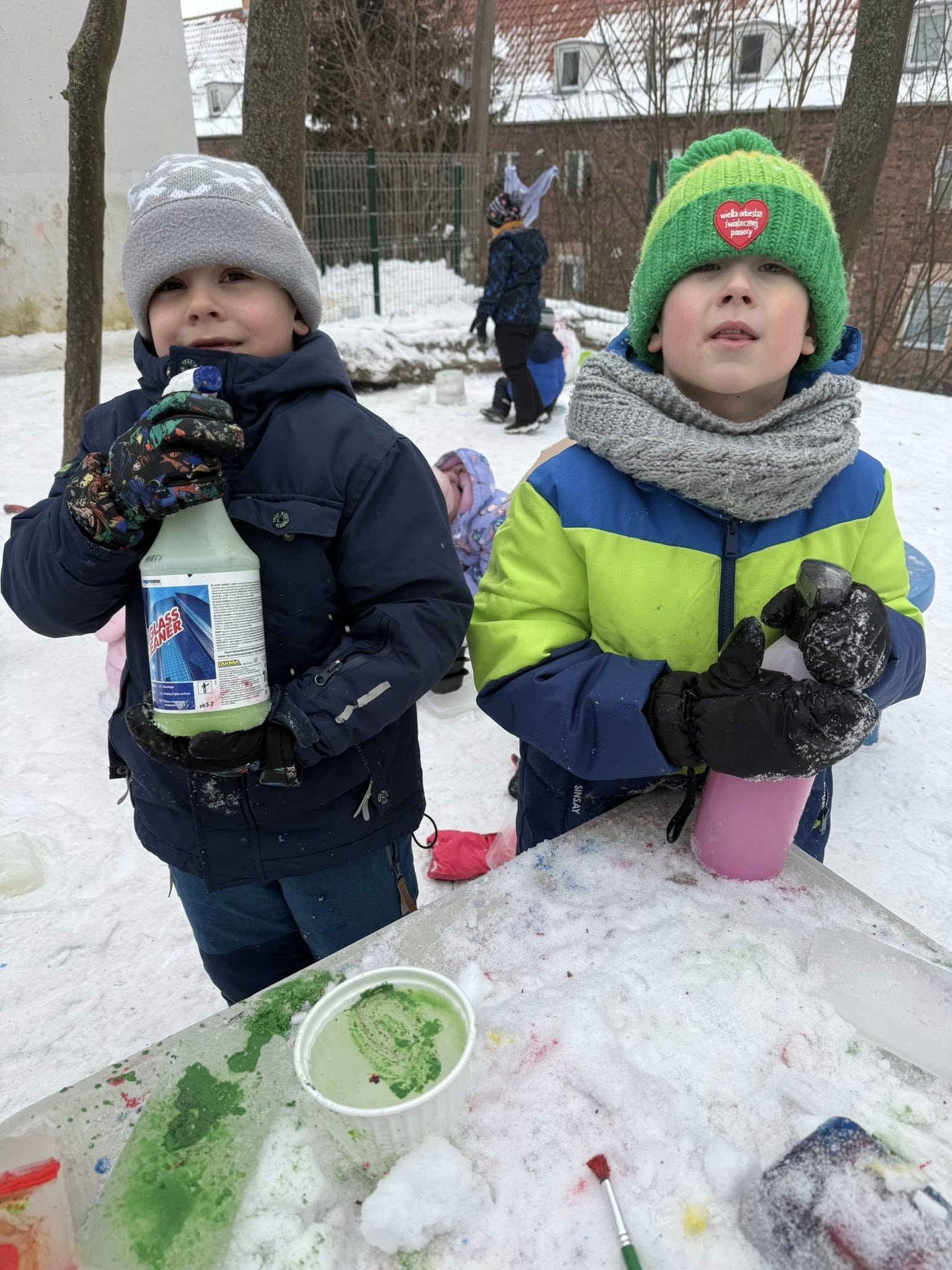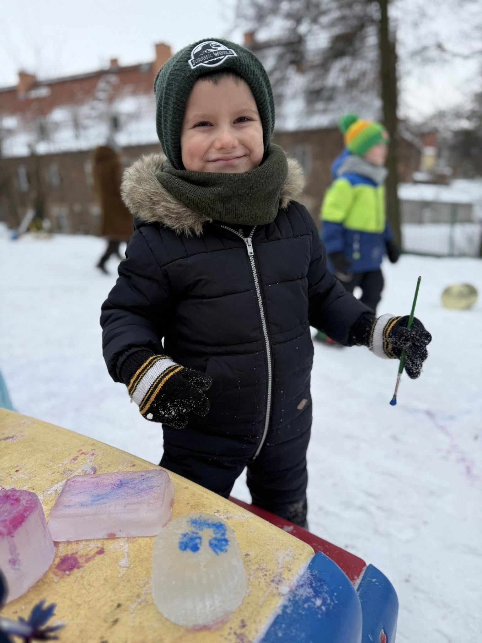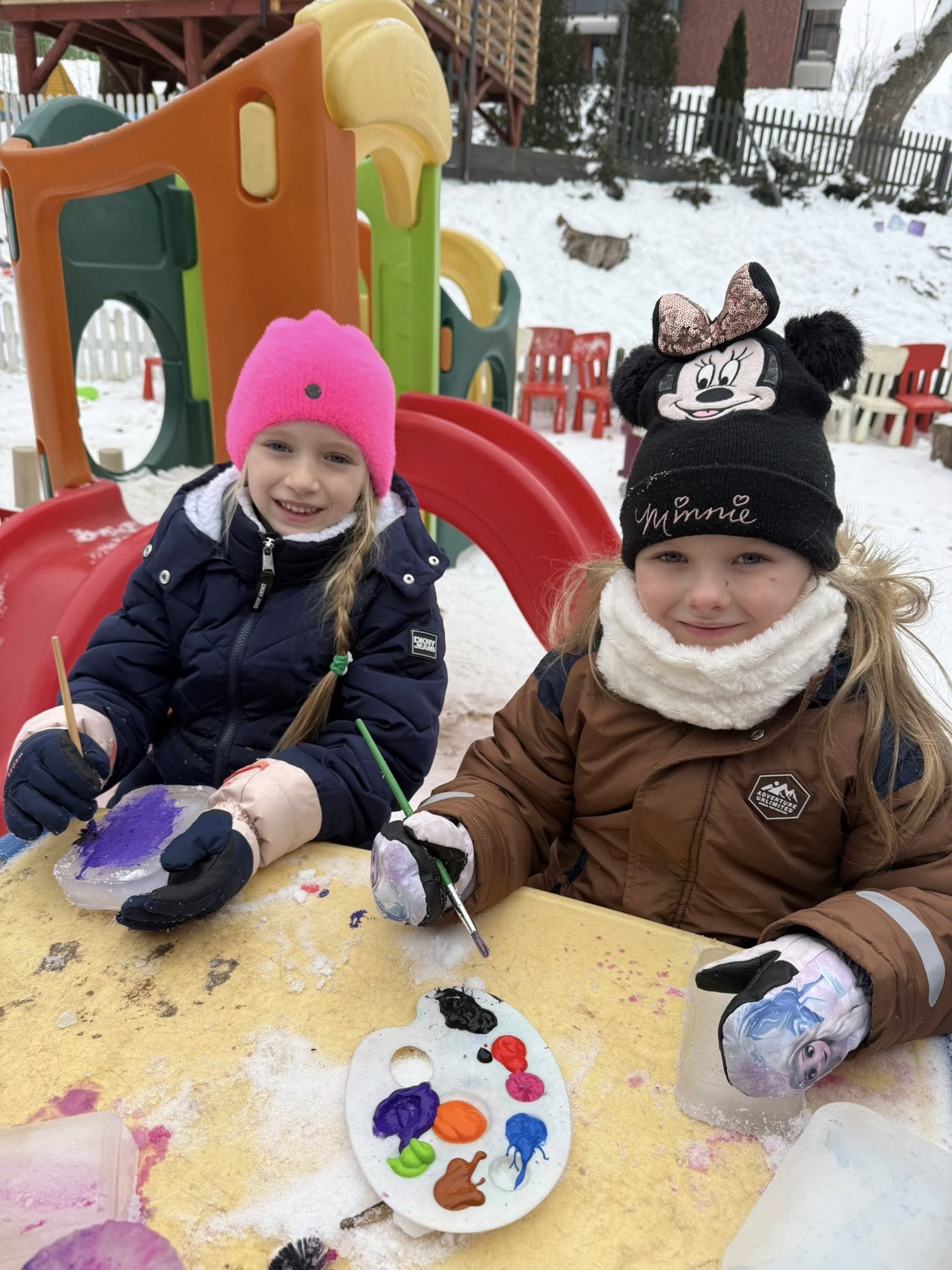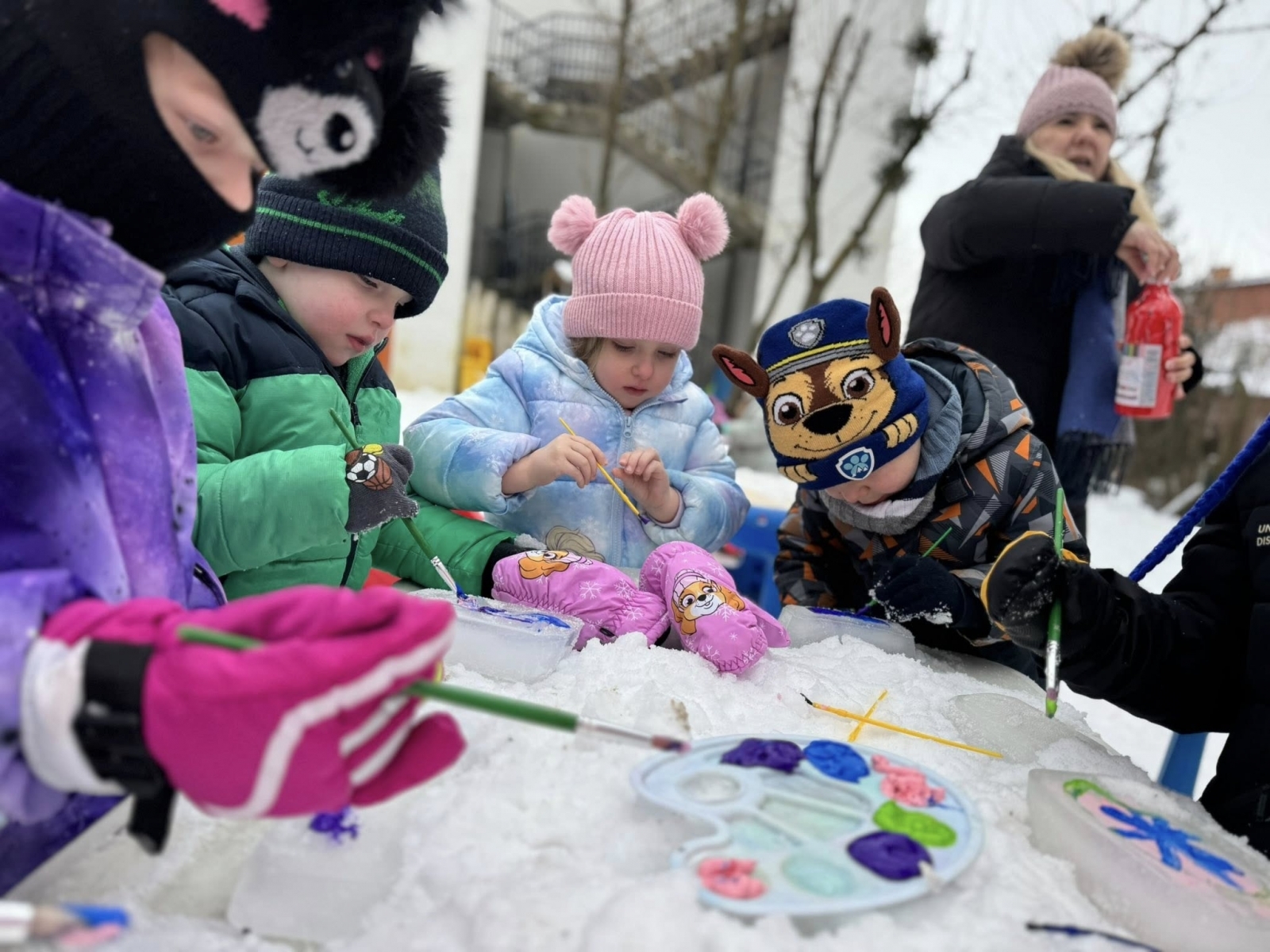 Pierwszy etap artystycznej przygody rozegrał się jeszcze wewnątrz placówki, gdzie na dzieci czekały przygotowane wcześniej lodowe bryły. Pod czujnym okiem wychowawców, maluchy chwyciły za pędzle i farby, by przekonać się, jak pigment reaguje z zamarzniętą wodą. Efekty przerosły oczekiwania – kolory nie tylko pokrywały powierzchnię lodu, ale powoli wnikały w jego strukturę, tworząc niepowtarzalne, przenikające się wzory.