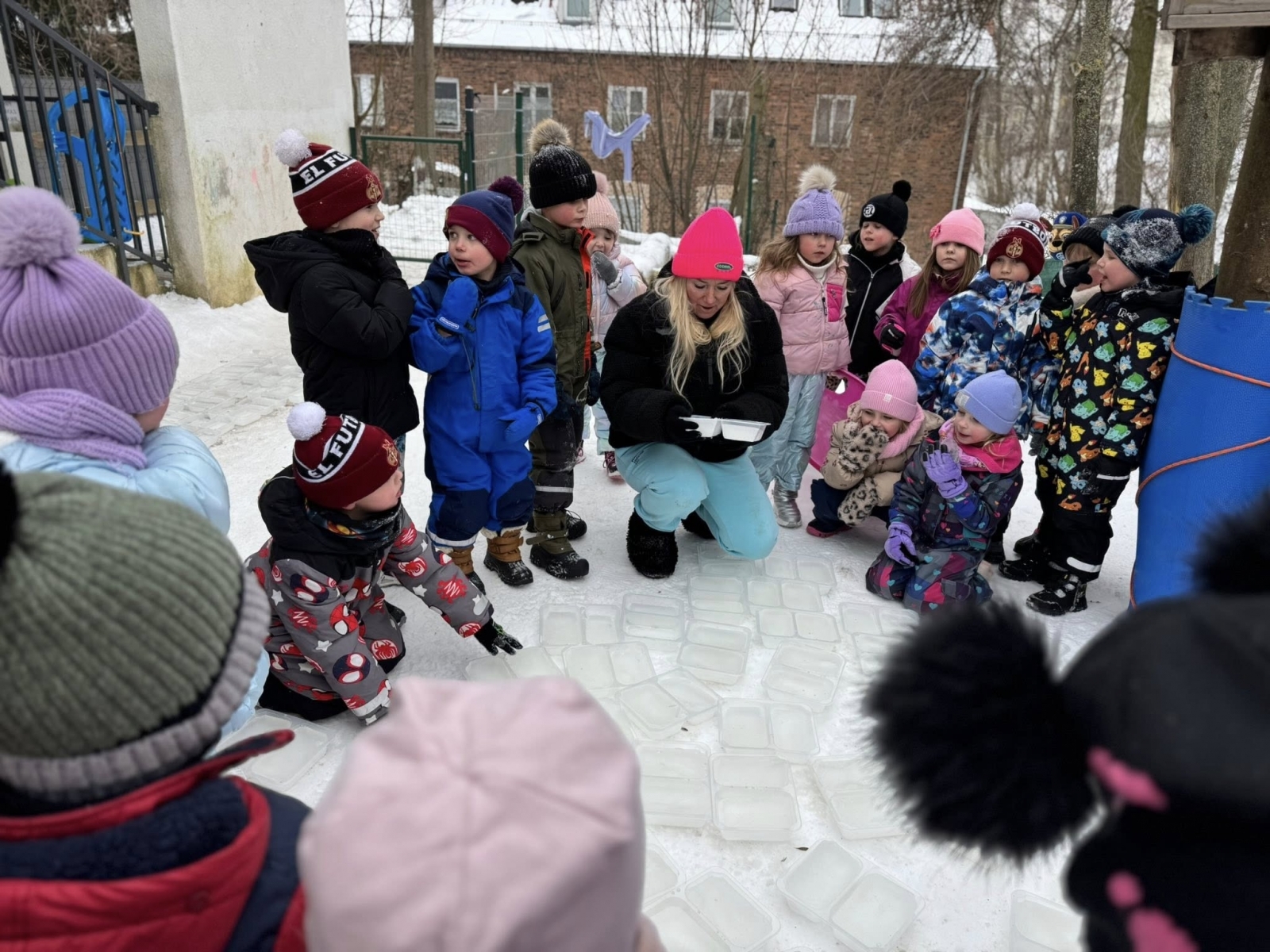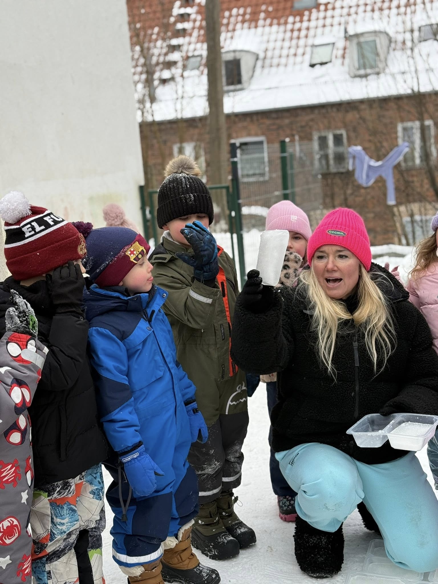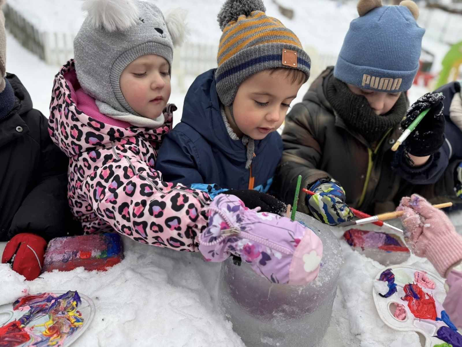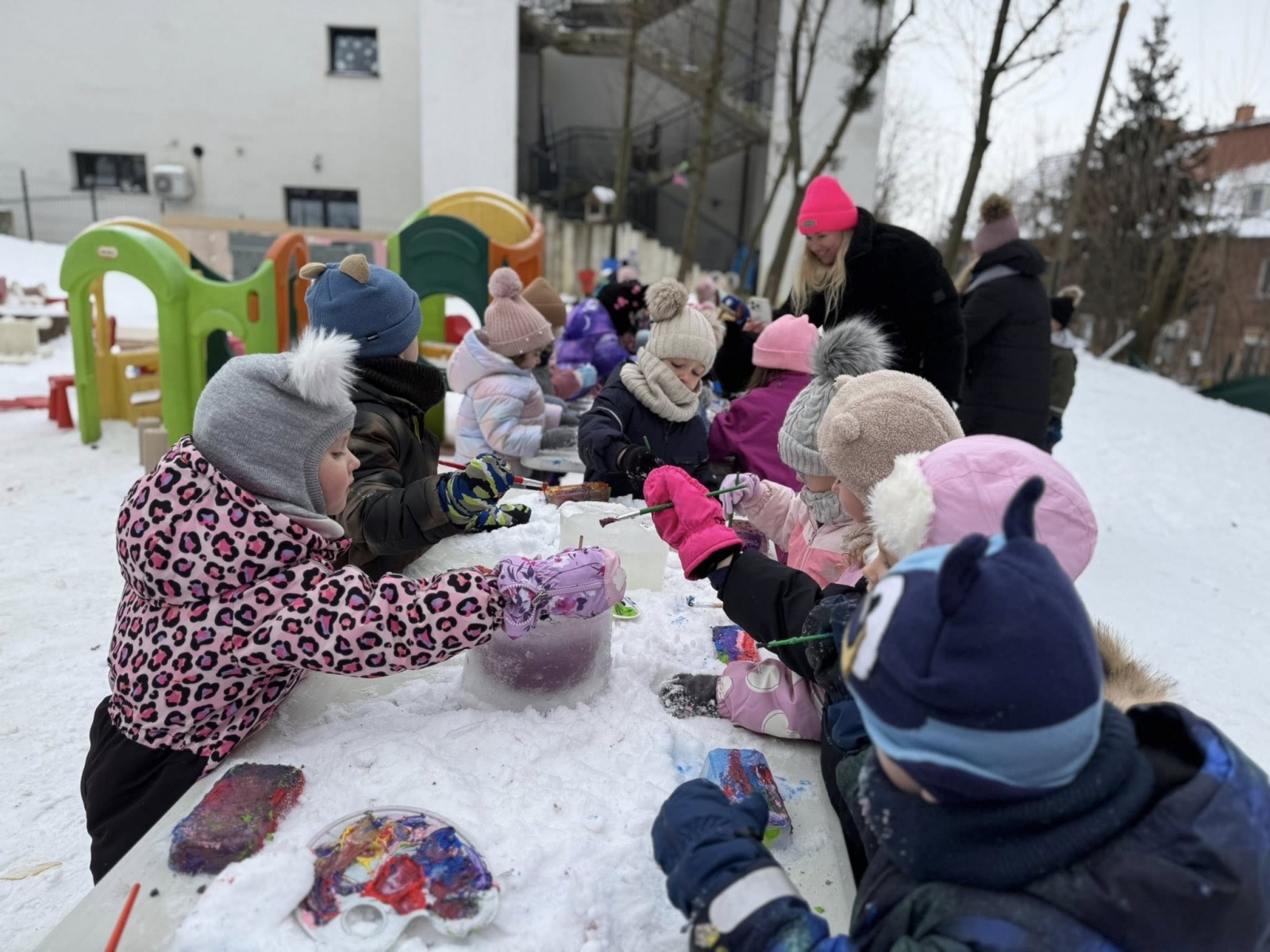 Pierwszy etap artystycznej przygody rozegrał się jeszcze wewnątrz placówki, gdzie na dzieci czekały przygotowane wcześniej lodowe bryły. Pod czujnym okiem wychowawców, maluchy chwyciły za pędzle i farby, by przekonać się, jak pigment reaguje z zamarzniętą wodą. Efekty przerosły oczekiwania – kolory nie tylko pokrywały powierzchnię lodu, ale powoli wnikały w jego strukturę, tworząc niepowtarzalne, przenikające się wzory.