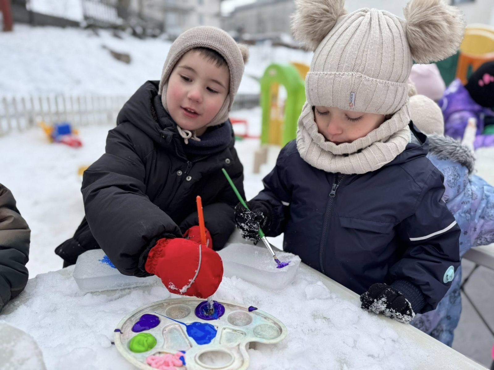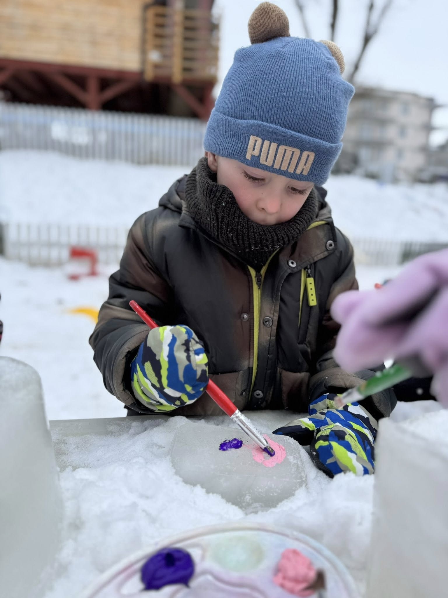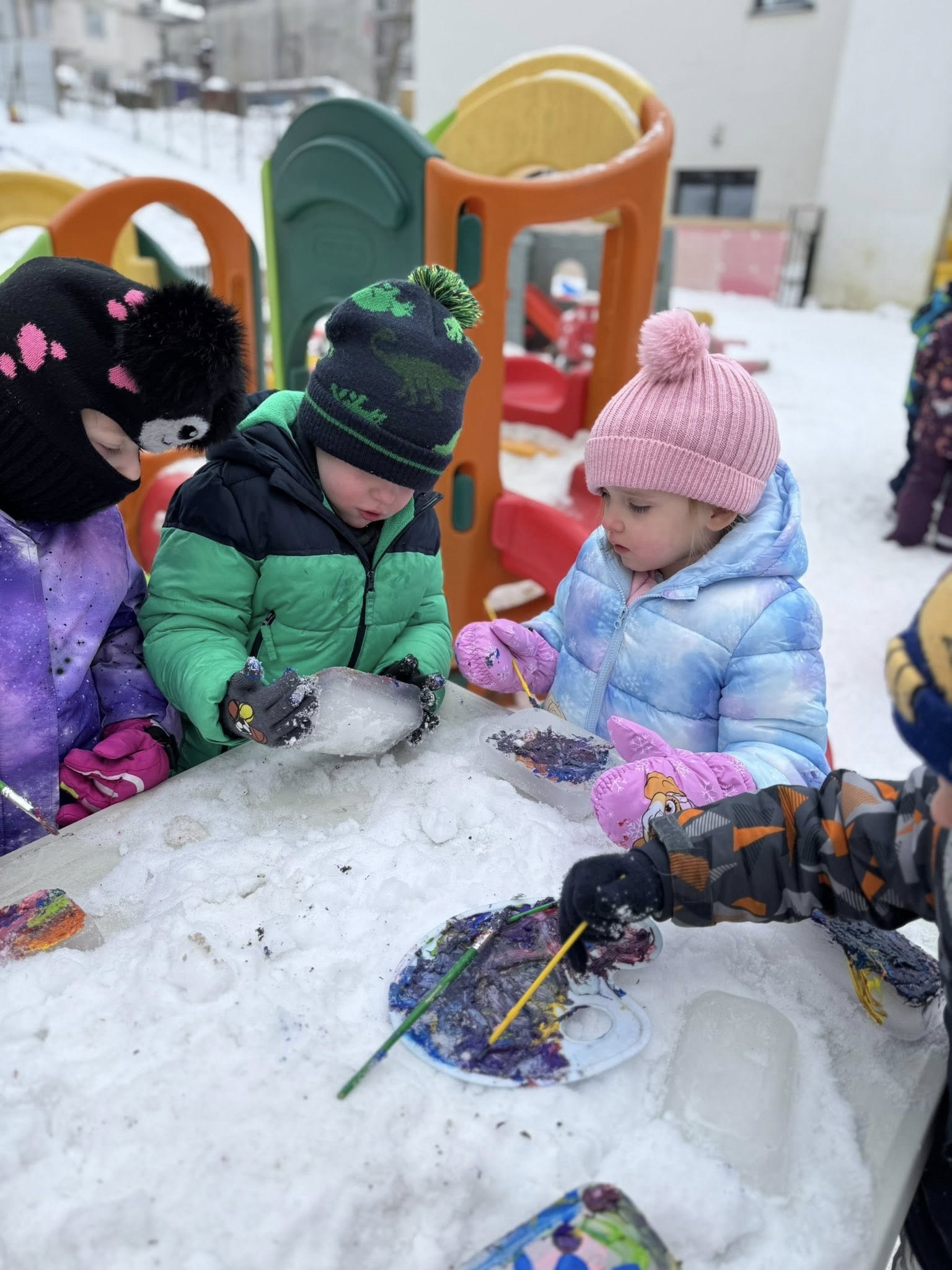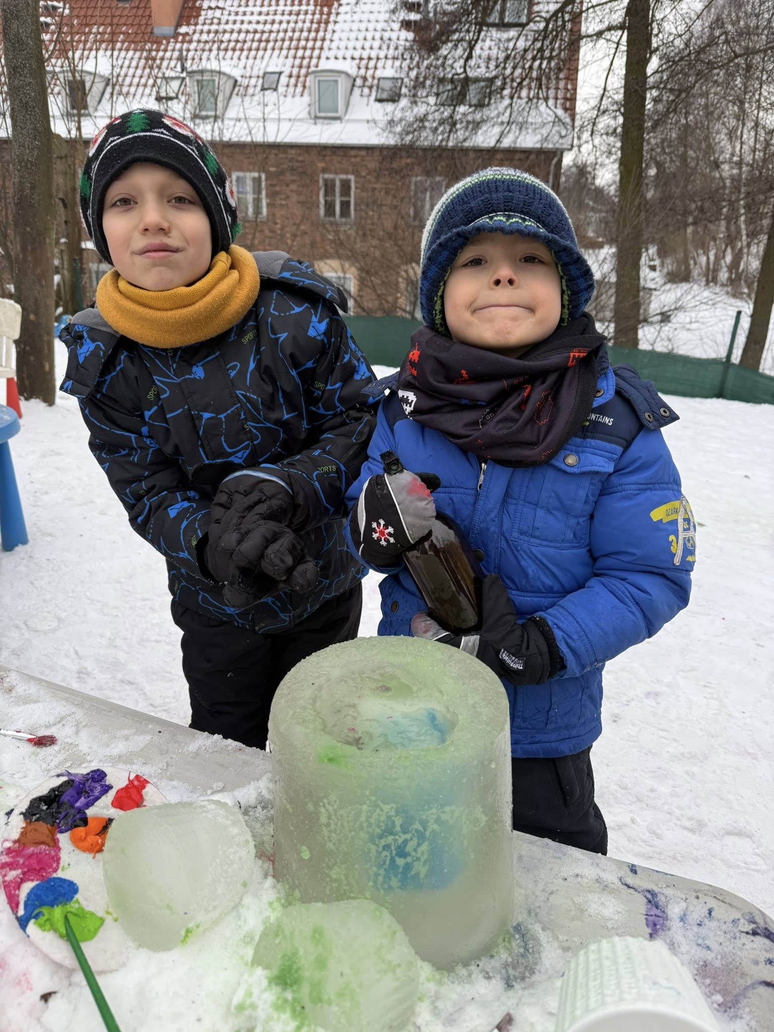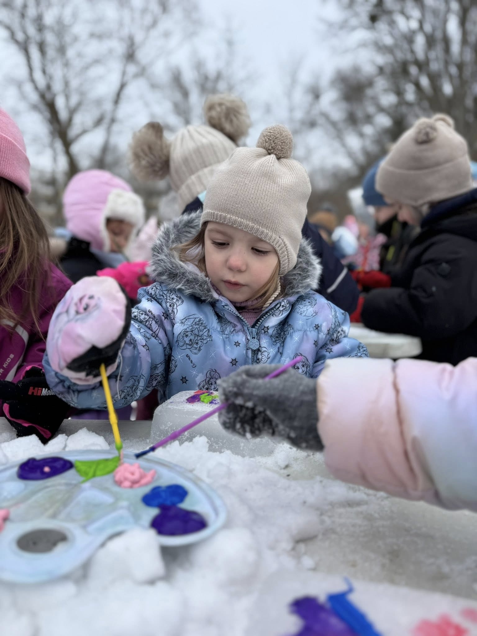 Pierwszy etap artystycznej przygody rozegrał się jeszcze wewnątrz placówki, gdzie na dzieci czekały przygotowane wcześniej lodowe bryły. Pod czujnym okiem wychowawców, maluchy chwyciły za pędzle i farby, by przekonać się, jak pigment reaguje z zamarzniętą wodą. Efekty przerosły oczekiwania – kolory nie tylko pokrywały powierzchnię lodu, ale powoli wnikały w jego strukturę, tworząc niepowtarzalne, przenikające się wzory.