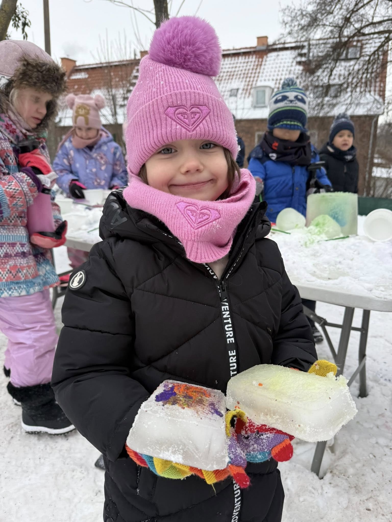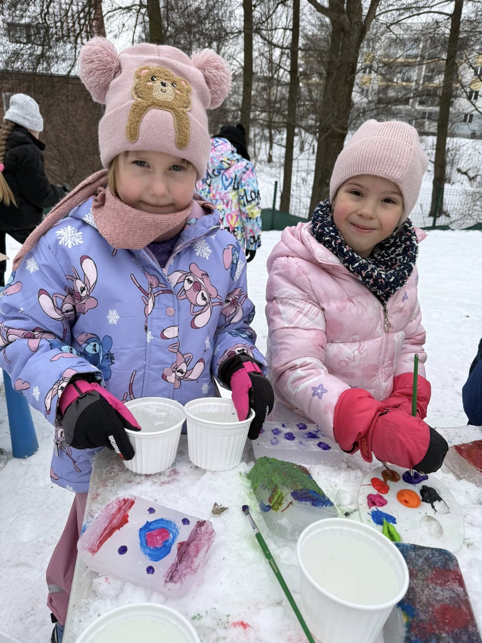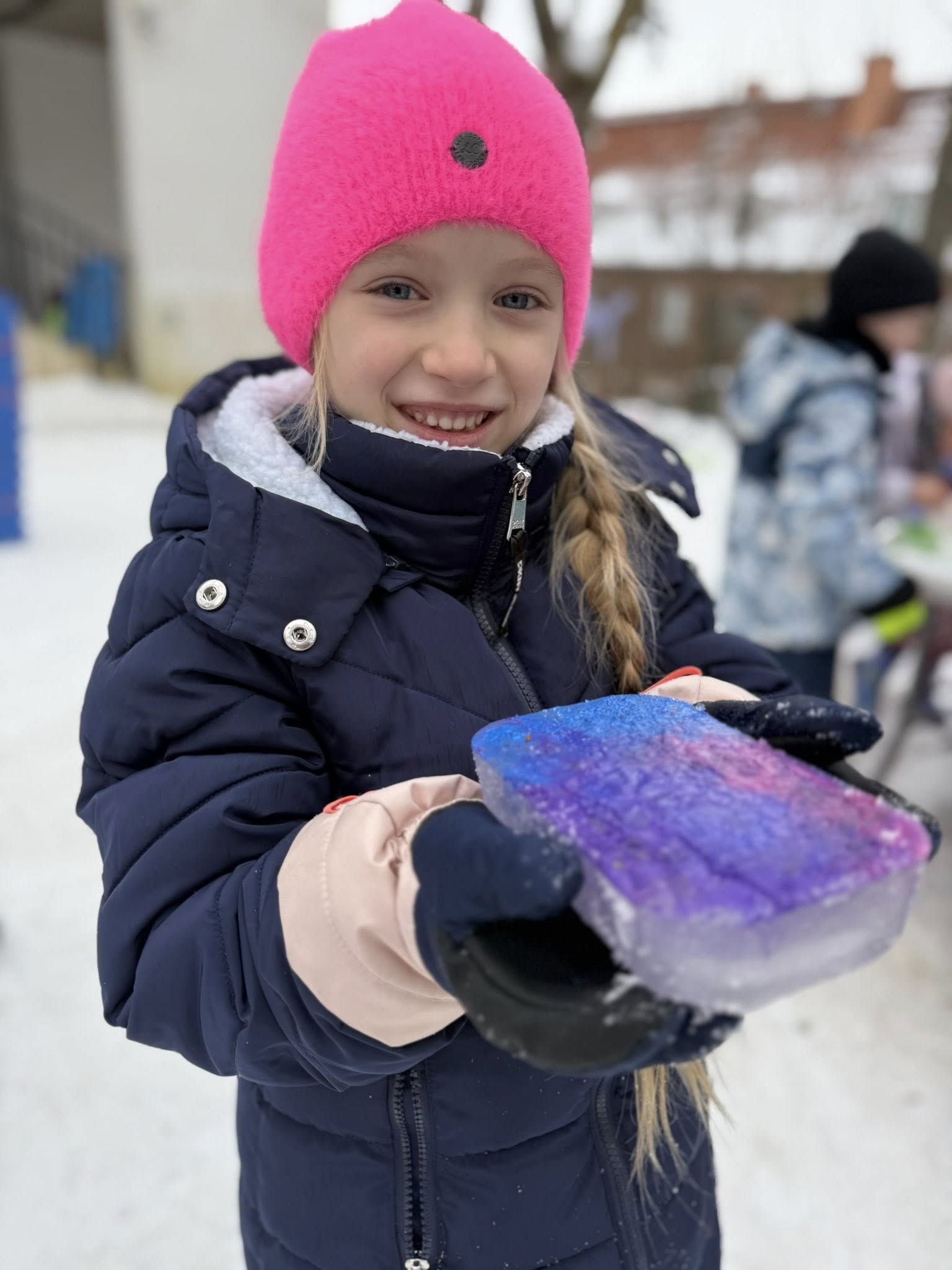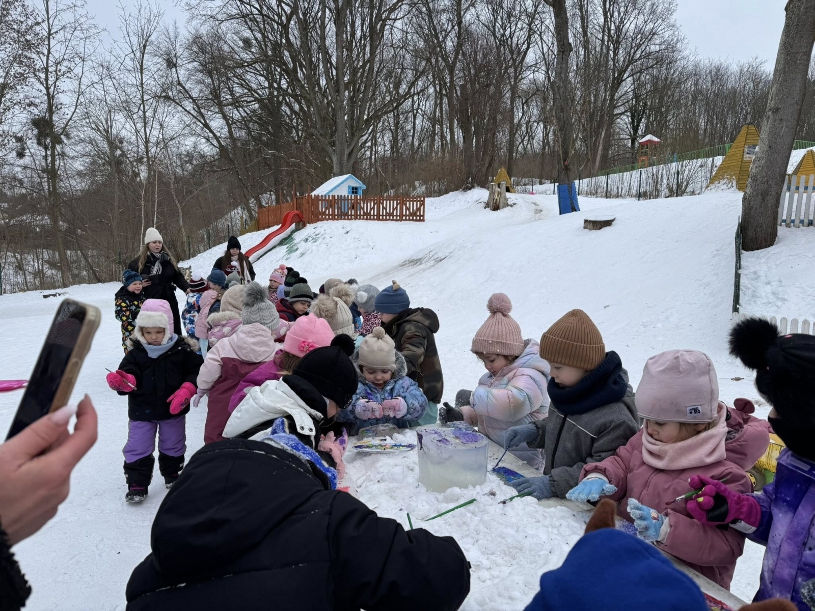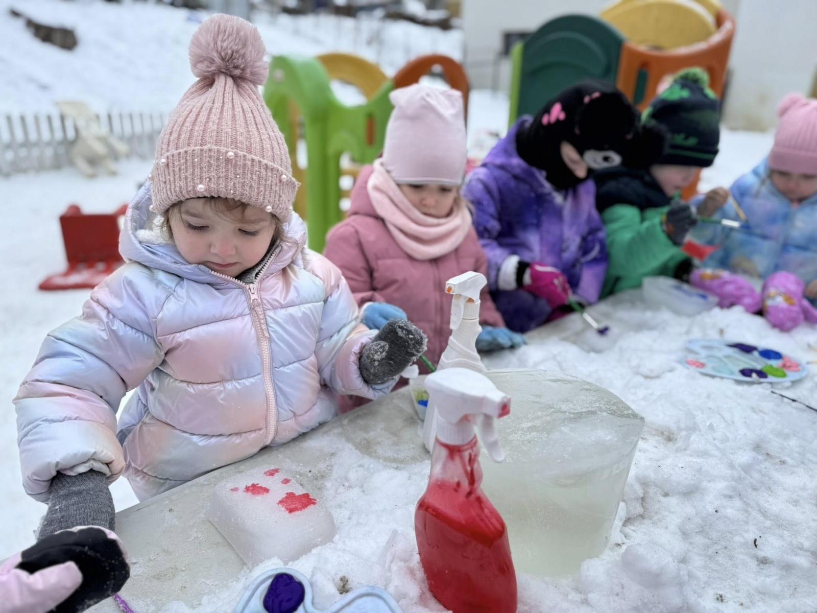 Pierwszy etap artystycznej przygody rozegrał się jeszcze wewnątrz placówki, gdzie na dzieci czekały przygotowane wcześniej lodowe bryły. Pod czujnym okiem wychowawców, maluchy chwyciły za pędzle i farby, by przekonać się, jak pigment reaguje z zamarzniętą wodą. Efekty przerosły oczekiwania – kolory nie tylko pokrywały powierzchnię lodu, ale powoli wnikały w jego strukturę, tworząc niepowtarzalne, przenikające się wzory.