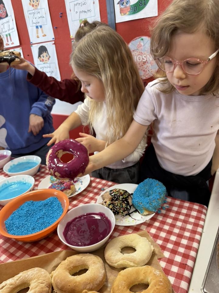 Zaczęliśmy od dotyku – przesiewanie mąki, która jest miękka i chłodna, a następnie dodawanie składników i wspólne zagniatanie ciasta. To moment, w którym dzieci uczą się cierpliwości i współpracy. Kolejnym krokiem był wzrok i węch. Zapach smażonych, ciepłych drożdżowych pyszności wypełnił całe przedszkole, budząc apetyt i ciekawość. Jednak prawdziwa magia zadziałała podczas dekorowania. Wybór kolorów lukru, posypywanie barwnymi kuleczkami i tworzenie fantazyjnych wzorów na własnoręcznie uformowanych donatach to moment, w którym artystyczna dusza Małych Europejczyków mogła w pełni wybrzmieć.